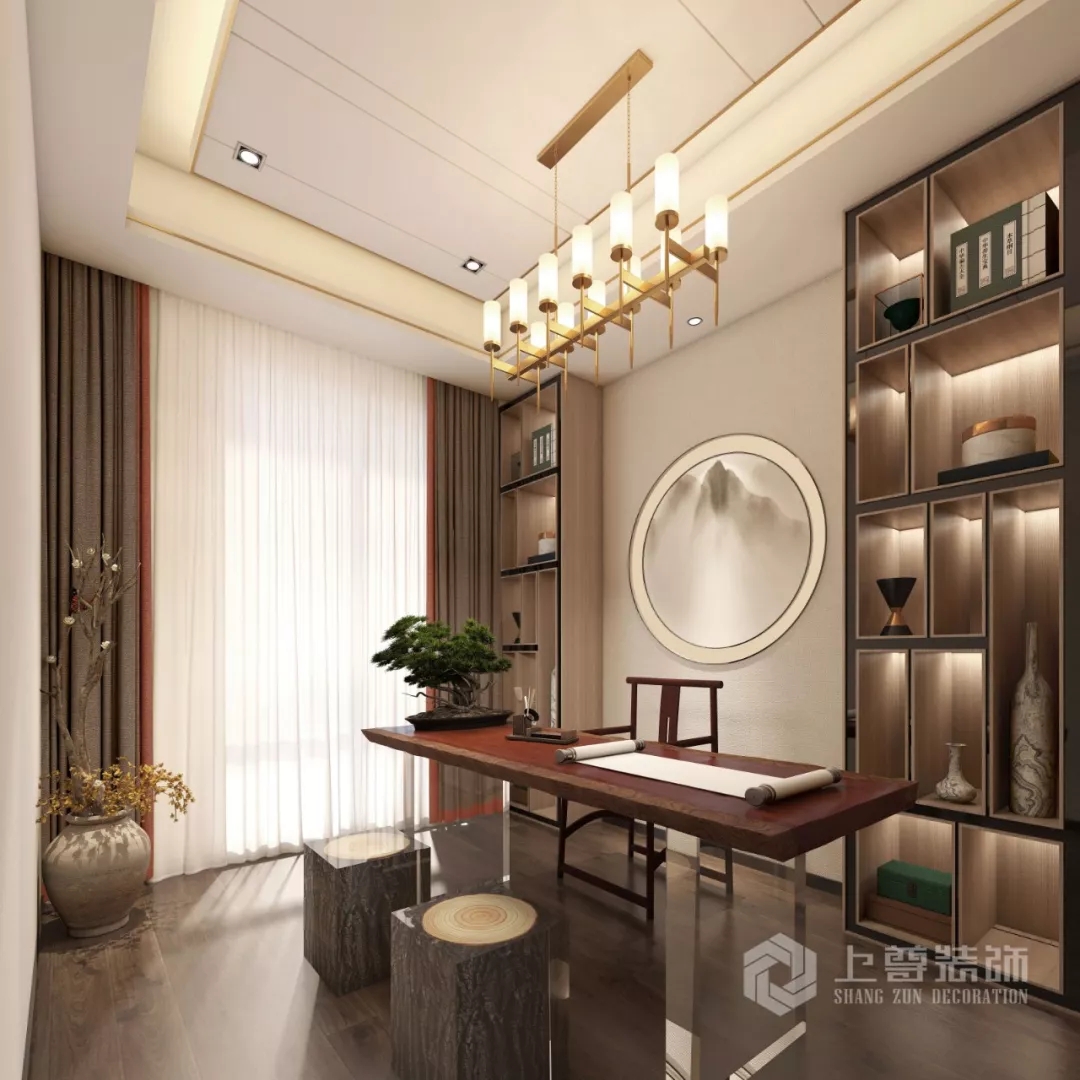 書房是男業主獨立思考和工作的自我空間。風格上,用了簡單的裝飾,營造出一個帶有中式禅意的空間。軟裝上,實木書櫃結合中式牆畫裝飾,與硬裝完美融合,非常幹淨地處理了空間的層次,營造出大氣的質感空間。